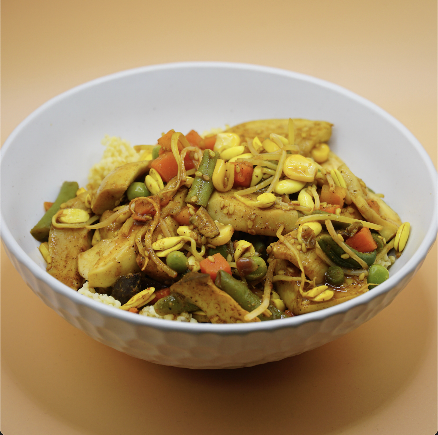 Grab a bowl and add some rice. Add the stir-fried veggies and dig in!